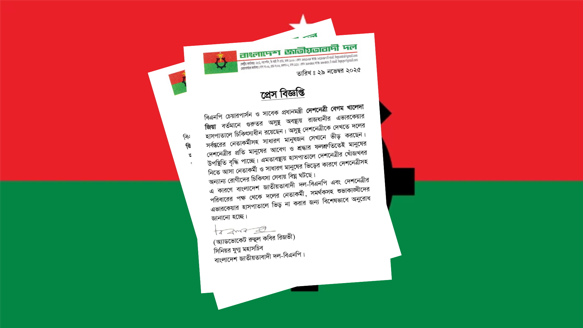 দলের পক্ষ থেকে জানানো হয়েছে, মানুষের এই ব্যাপক উপস্থিতি দেশের মানুষের খালেদা জিয়ার প্রতি শ্রদ্ধা ও আবেগের প্রতিফলন হলেও এতে হাসপাতালের পরিবেশে চাপ সৃষ্টি হচ্ছে এবং অন্যান্য রোগীদের চিকিৎসা সেবায় বিঘ্ন ঘটছে। বিশেষত দেশের অসুস্থ রাজনৈতিক নেত্রীকে ঘিরে ভিড় বৃদ্ধির কারণে চিকিৎসক এবং হাসপাতাল কর্মীদের পক্ষে সঠিক ও নিরাপদ চিকিৎসা সেবা নিশ্চিত করা কঠিন হয়ে পড়েছে।