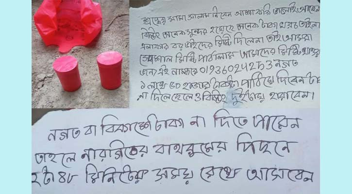 চিরকুটে লেখা রয়েছে, ‘শ্রদ্ধেয় মামা সালাম নিবেন আশা করি ভালোই আছেন বিল্ডিং অনেক সুন্দর হয়েছে অনেক টাকা খরচ তাইনা? এলাকার বড় ভাইদের মিষ্টি দিলেন তাই আমরা সোশাল মিষ্টি পাঠালাম আমাদের মিষ্টি খাওয়ার জন্য এই নাম্বার ০১৯৩৬-০২৪২৫৩ নগত ১ লাখ ৫০ হাজার টাকা পাঠিয়ে দিবেন, না দিলে ছেলে ও বিল্ডিং দুইটায় হারাবেন। নগত বা বিকাশে টাকা না দিতে পারেন তাহলে নারগিসের বাথরুমের পিছনে ২টা ৪৮ মিনিটের সময় রেখে আসবেন।’