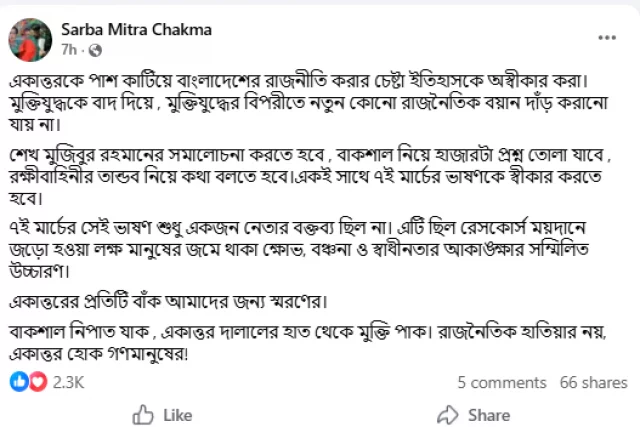 স্ট্যাটাসে সর্বমিত্র চাকমা লিখেছেন, ‘একাত্তরকে পাশ কাটিয়ে বাংলাদেশের রাজনীতি করার চেষ্টা ইতিহাসকে অস্বীকার করা। মুক্তিযুদ্ধকে বাদ দিয়ে, মুক্তিযুদ্ধের বিপরীতে নতুন কোনো রাজনৈতিক বয়ান দাঁড় করানো যায় না।’