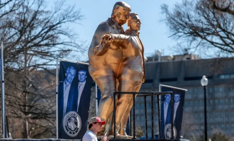 যুক্তরাষ্ট্রের রাজধানী ওয়াশিংটন, ডিসি-এর ন্যাশনাল মলে মঙ্গলবার (১০ মার্চ) একটি ব্যঙ্গাত্মক ভাস্কর্য স্থাপন করা হয়েছে, যা প্রেসিডেন্ট ডোনাল্ড ট্রাম্প এবং মৃত্যু দণ্ডপ্রাপ্ত যৌন অপরাধী জেফ্রি এপস্টিন-কে ‘টাইটানিক প্রেমিক’ রূপে দেখাচ্ছে।