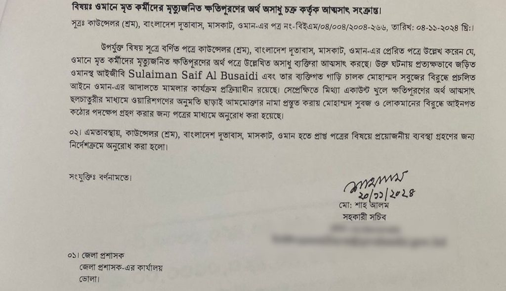 প্রজ্ঞাপনে বলা হয়, ওমানের নাগরিক সুলাইমান সাইফ আল বুসাইদির নাম ব্যবহার করে বিভিন্ন কৌশলে ভুয়া অ্যাকাউন্ট খুলে ক্ষতিপূরণের অর্থ আত্মসাৎ করা হচ্ছে। এ ঘটনায় ইতিমধ্যে ওমানের আদালতে মামলা প্রক্রিয়াধীন রয়েছে।