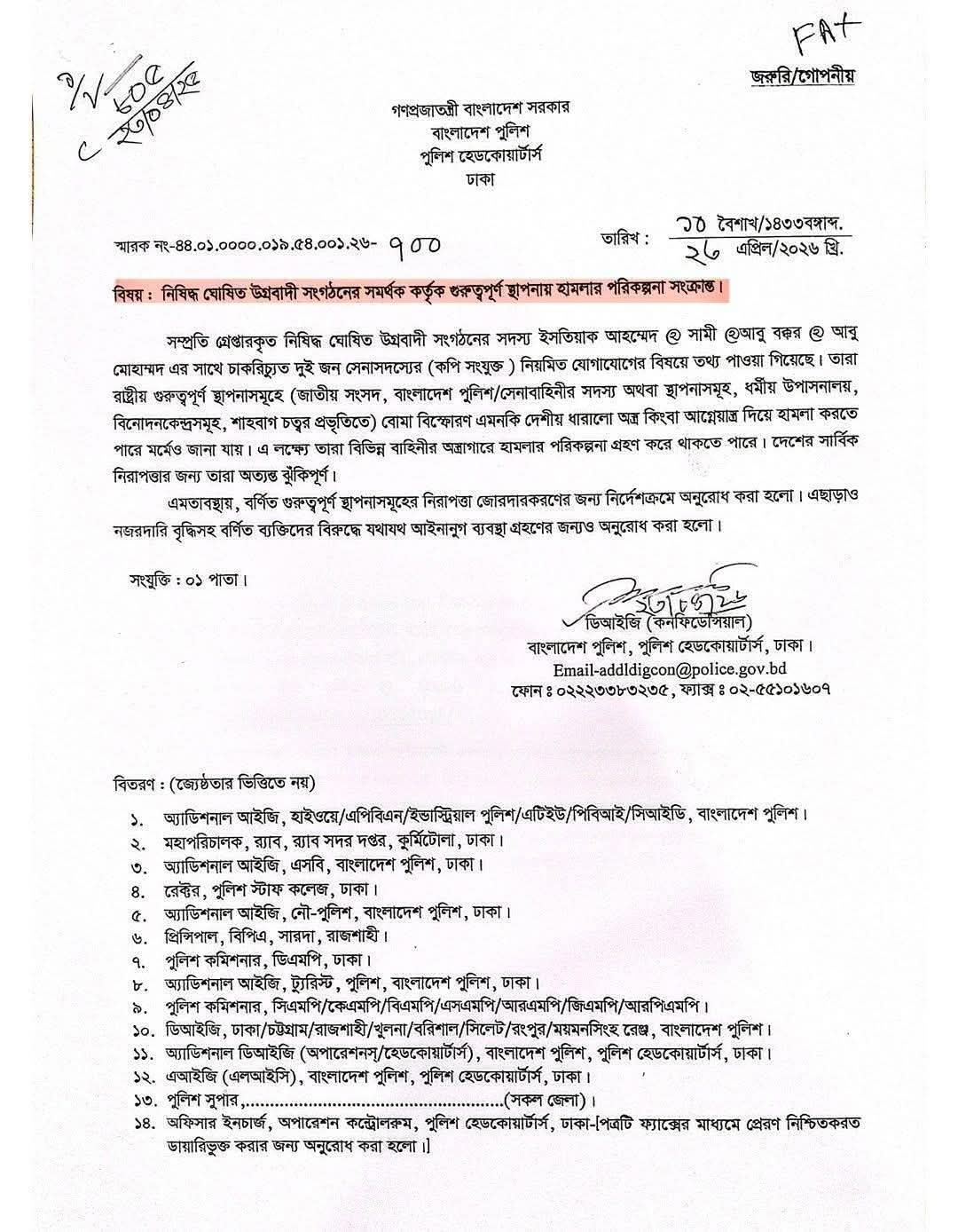 গুরুত্বপূর্ণ স্থাপনায় হামলার পরিকল্পনা, সতর্কবার্তা জারি পুলিশের
